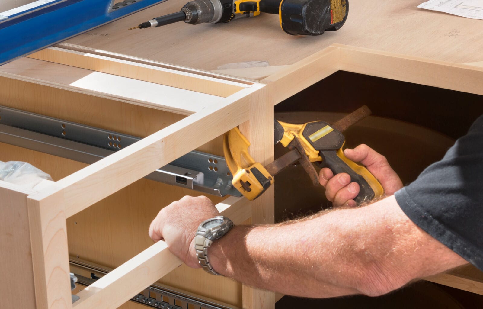 Clamps secure cabinet frames together during fastening, align boxes perfectly, and keep parts stable during glue-ups or drilling.